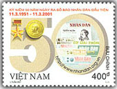 Nh©n kû niÖm 50 n¨m ngµy ra sè b¸o Nh©n d©n ®Çu tiªn, Tæng côc Bu ®iÖn ph¸t hµnh bé tem "Kû niÖm 50 n¨m ngµy ra sè b¸o Nh©n d©n ®Çu tiªn (11/3/1951 - 11/3/2001)". Bé 1 mÉu, gi¸ mÆt 400®, giíi thiÖu h×nh ¶nh sè b¸o Nh©n d©n ®Çu tiªn (Sè 1, ngµy 11/3/1951) cïng tê b¸o "Cê gi¶i phãng" n¨m 1945, "Sù ThËt" n¨m 1949, lµ hai tê b¸o tiÒn th©n cña b¸o Nh©n d©n.